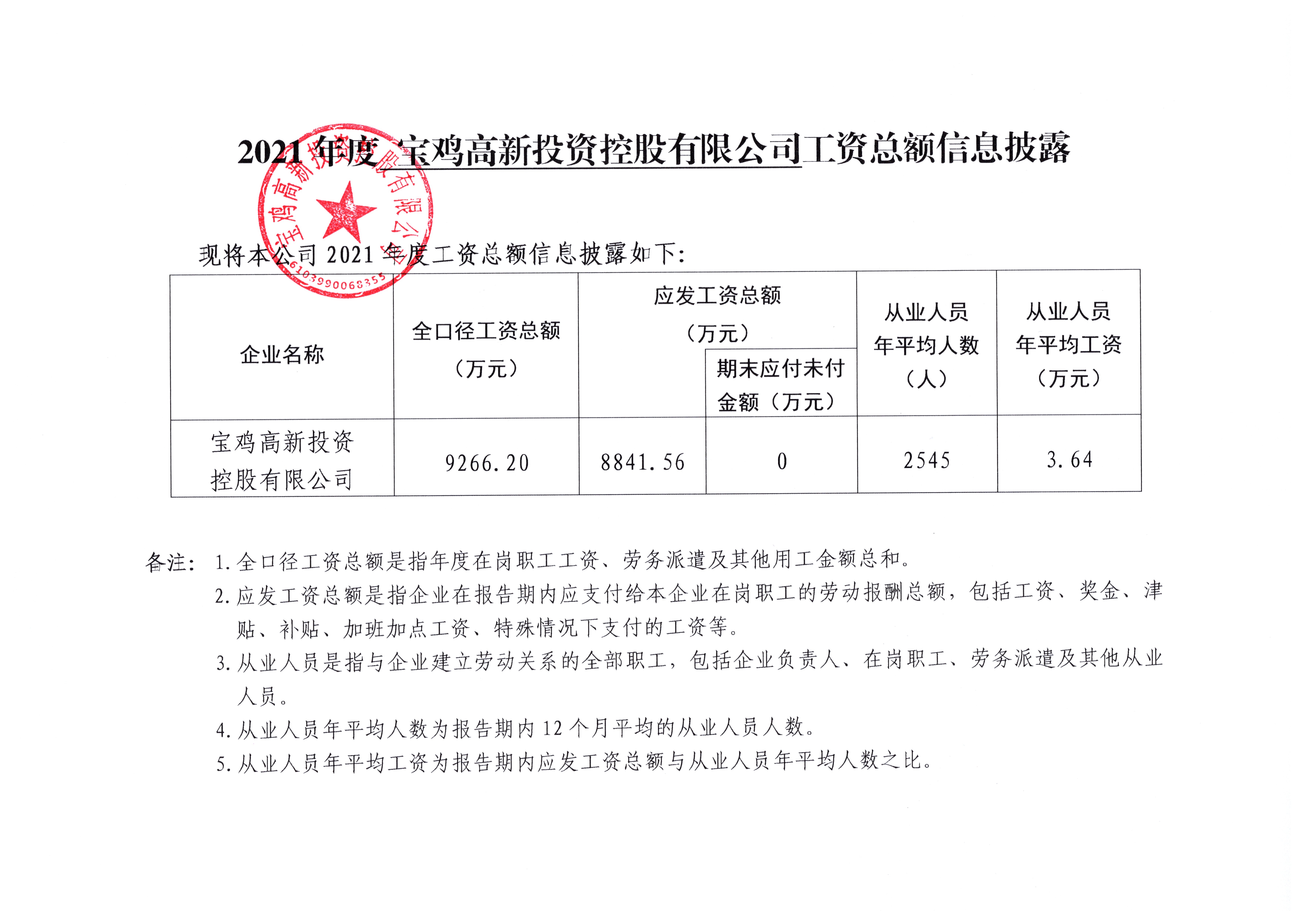 2021年度寶雞高新投資控股有限公司工資總額信息披露